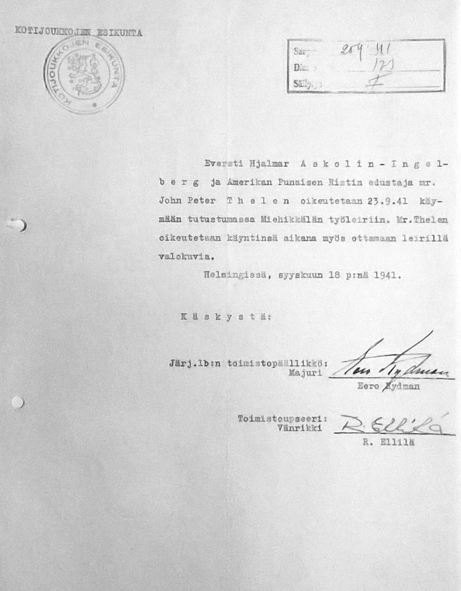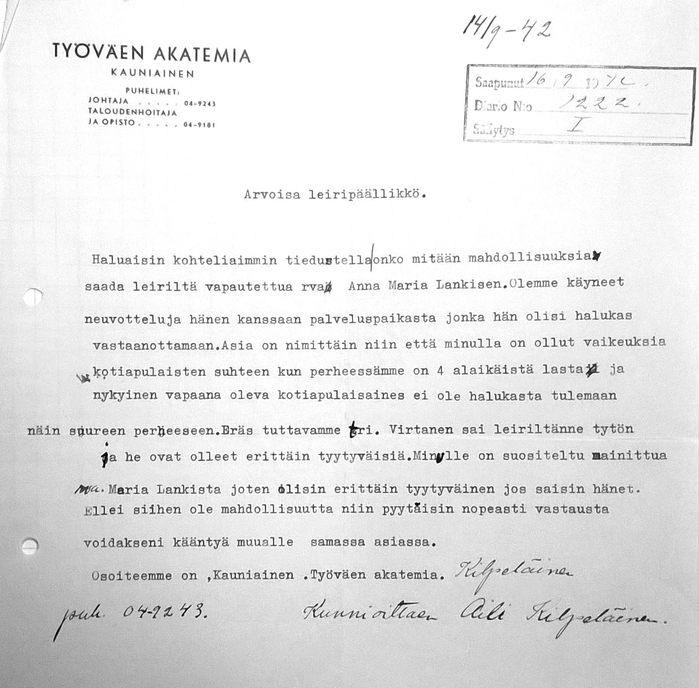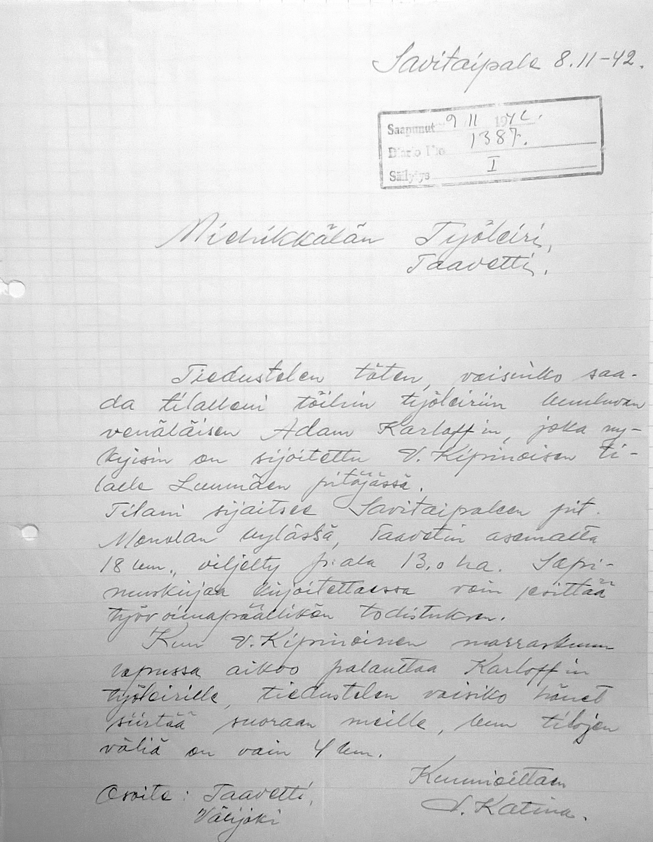 Viitaten t.k:n 11 p:nä päivättyyn kirjeeseenne, ilmoitamme, että Teiltä on mennyt anomus Kotijoukkojen Esikuntaan, joka on toimittanut sen edelleen. Anomuksenne johdosta on nyt Sisäasiainministeriön valtiollisen poliisin jaosto myöntänyt Katri Akkaselle ja hänen tyttärelleen työ- ja oleskeluluvan Suomessa. Tämän perusteella he saavat myöskin kaikki tarvittavat elintarvikekortit. On sangen ikävää huomata, että saatuanne meiltä nämä yllämainitut henkilöt työhönne jo ennen oleskeluluvan saapumista ja käyttäen hyväksenne tätä halpaa ja hyvää työvoimaa kiireellisimpänä aikana aiotte nyt lähettää takaisin leirille nämä inkeriläiset. Asia ei kuitenkaan ole niin yksinkertainen kuin ehkä luulette, kuten jo kerran mainitsin, on Katri Akkasen anottava siirtoa Sisäasiainministeriöstä ja Te olette velvollinen huolehtimaan hänestä niin kauan.