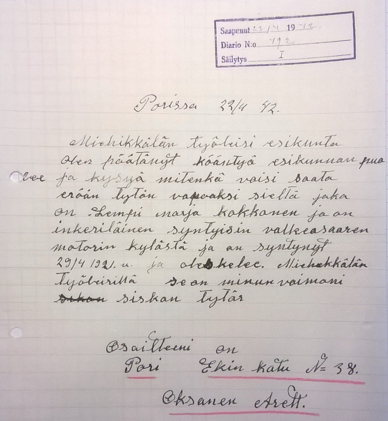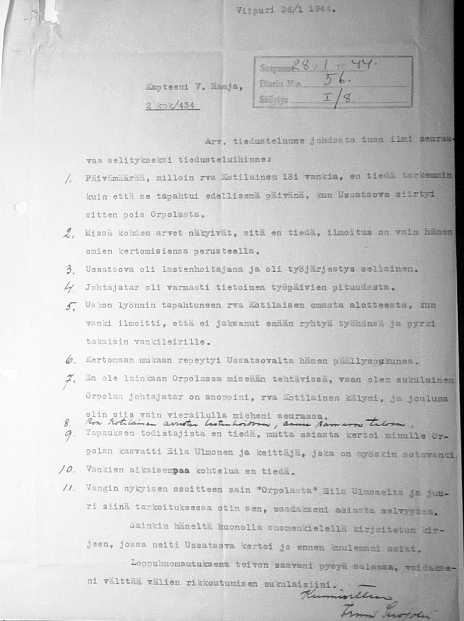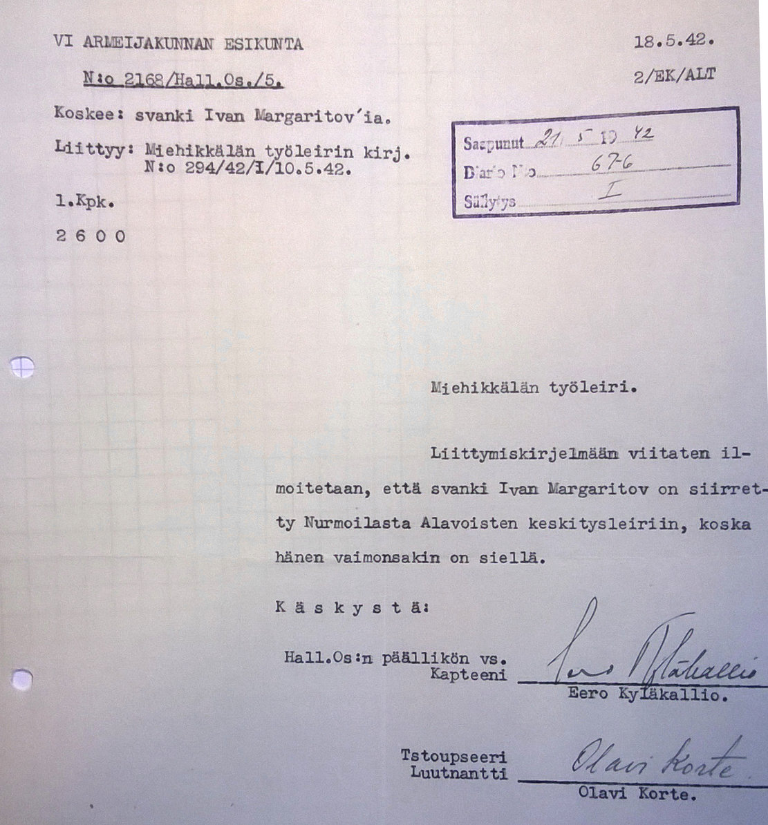 Viitaten t.k:n 11 p:nä päivättyyn kirjeeseenne, ilmoitamme, että Teiltä on mennyt anomus Kotijoukkojen Esikuntaan, joka on toimittanut sen edelleen. Anomuksenne johdosta on nyt Sisäasiainministeriön valtiollisen poliisin jaosto myöntänyt Katri Akkaselle ja hänen tyttärelleen työ- ja oleskeluluvan Suomessa. Tämän perusteella he saavat myöskin kaikki tarvittavat elintarvikekortit. On sangen ikävää huomata, että saatuanne meiltä nämä yllämainitut henkilöt työhönne jo ennen oleskeluluvan saapumista ja käyttäen hyväksenne tätä halpaa ja hyvää työvoimaa kiireellisimpänä aikana aiotte nyt lähettää takaisin leirille nämä inkeriläiset. Asia ei kuitenkaan ole niin yksinkertainen kuin ehkä luulette, kuten jo kerran mainitsin, on Katri Akkasen anottava siirtoa Sisäasiainministeriöstä ja Te olette velvollinen huolehtimaan hänestä niin kauan.