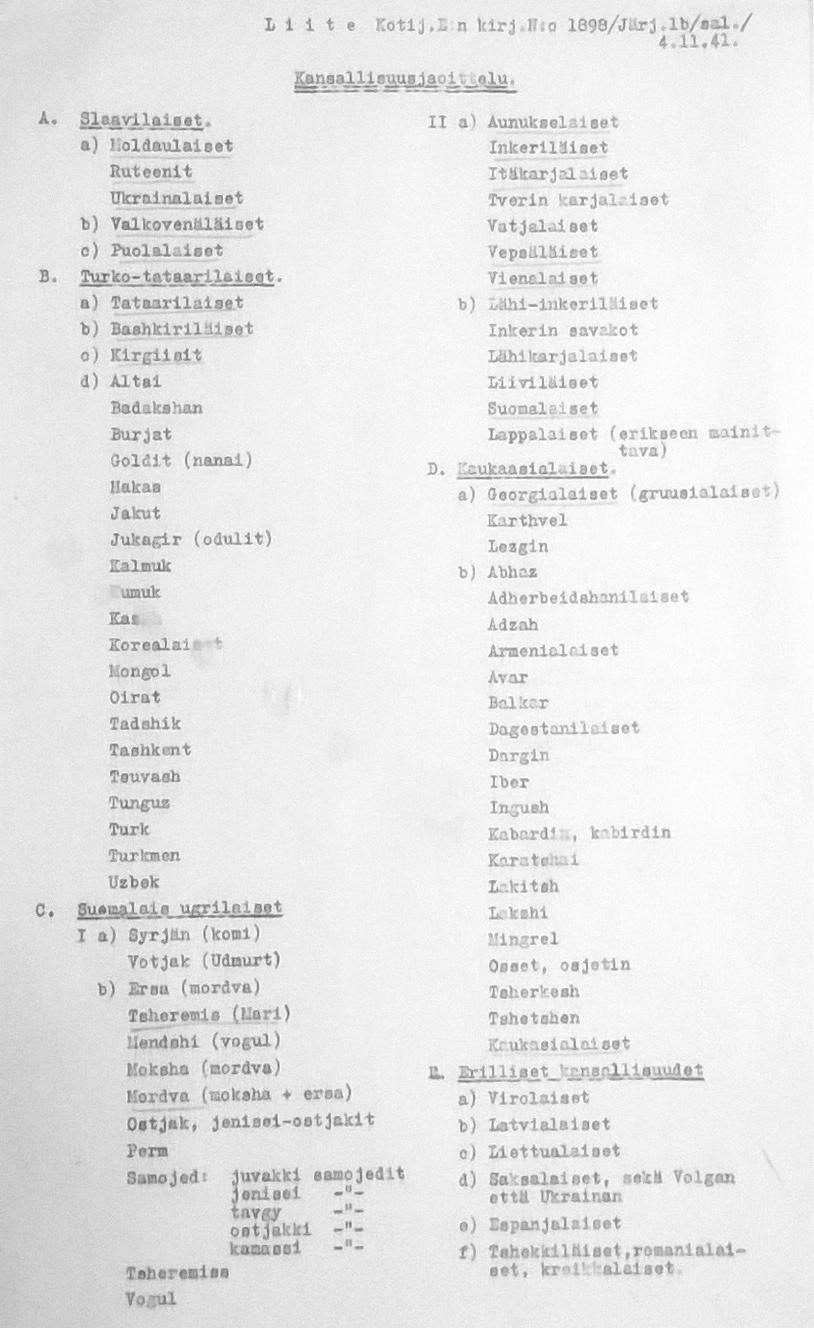 Liki 100 kansallisuutta käsittänyt luettelo on mitä ilmeisimmin laadittu sotavankikortit täyttänyttä Punaista Ristiä varten. - Kuva Seppo Jyrkinen, vapaasti käytettävissä.
