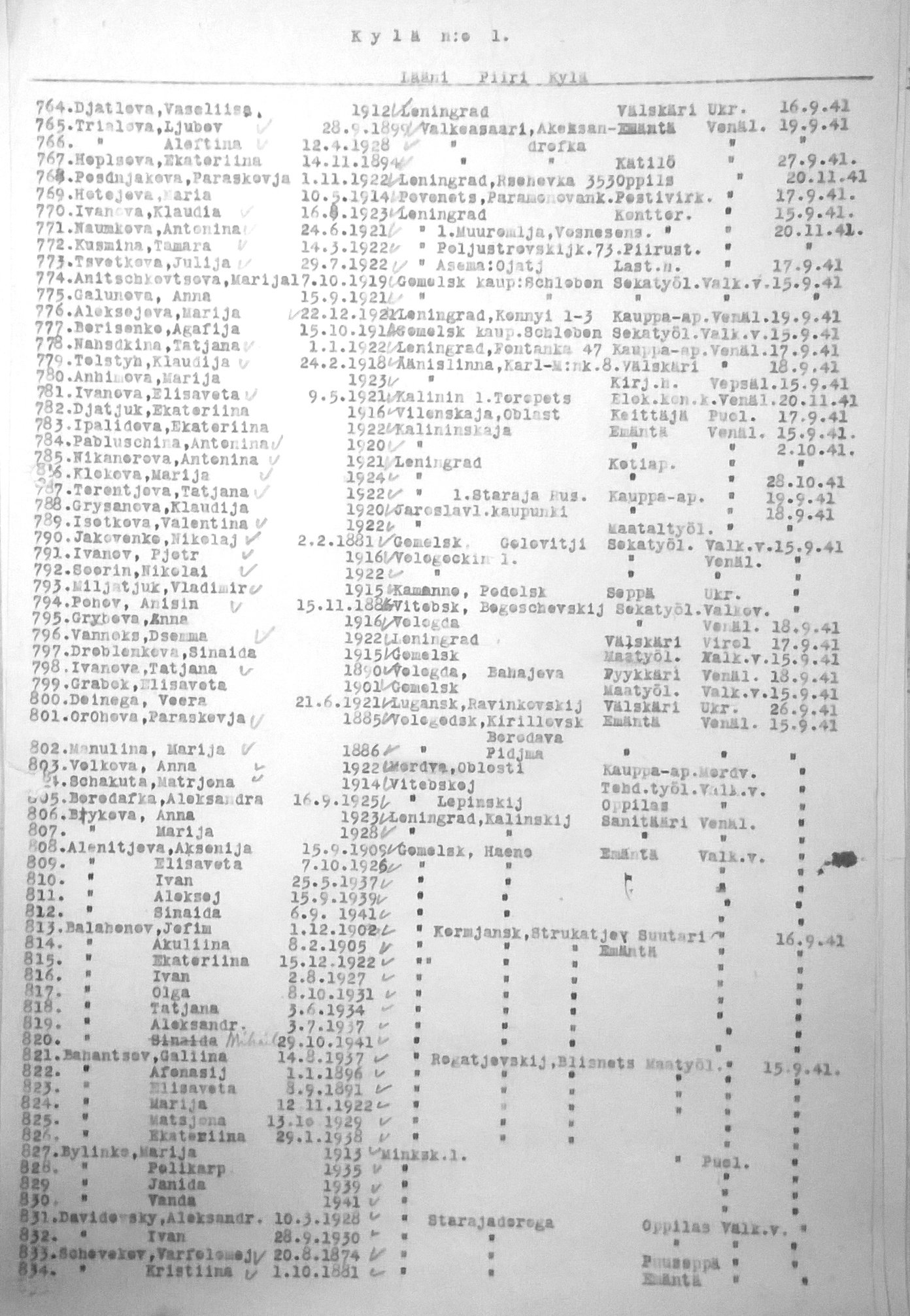 Alla olevista linkeistä aukeavat kylien osittaiset asukasluettelot on laadittu päivämäärällä 25.11.1942 jolloin valtaosa suomensukuisista ja muslimeista oli jo poistunut leiriltä. Useita sivuja puuttuu.
