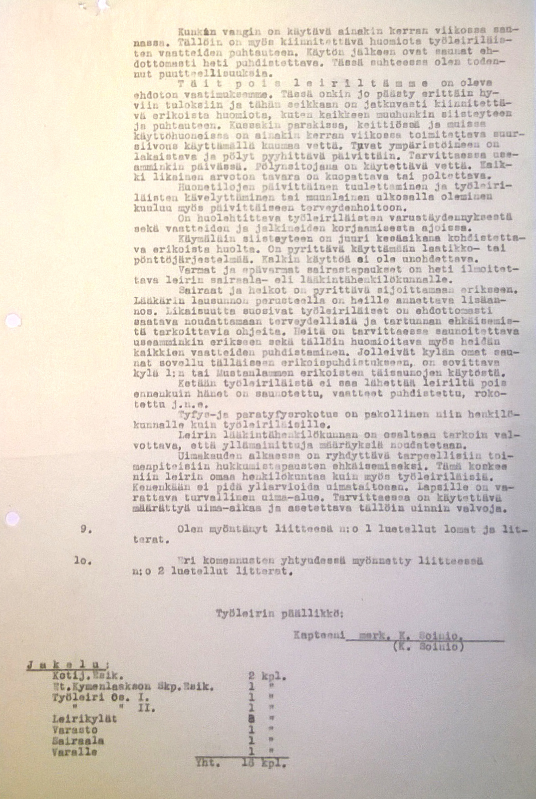 Miehikkälän työleirissä oli kaksi lasta hukkunut, minkä johdosta työleirin päällikkö kapteeni K. Soinio määräsi, että lasten uimarannalle on asetettava valvoja. Päiväkäsky annettu 13.5.1942. Sivu 1 ja sivu 2, jälkimmäisen kohdan 8 viimeinen kappale: