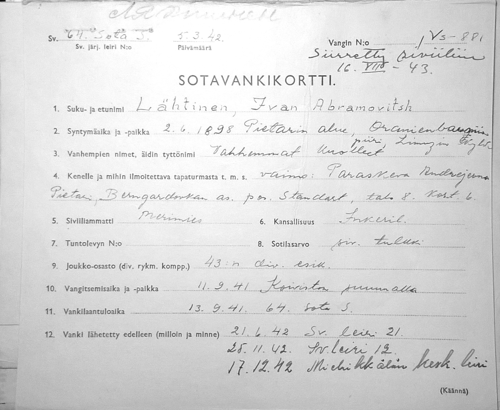 Inkeriläinen sotavanki Ivan Abramovitsh Lähtinen (tai Lahtinen), on otettu vangiksi 11.9.1941, siirretty kahden sotavankileirin kautta Miehikkälään 17.12.1942 ja sieltä edelleen siviiliin 16.7.1943.