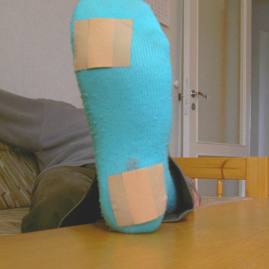 Leikkasin leveästä laastarista 6 x 6 cm kokoisia paloja, jotka laitoin sukkien pohjiin, päkiän ja kantapään alle. Ne toimivat yllättävän hyvin liukuesteinä kovalla lattialla.